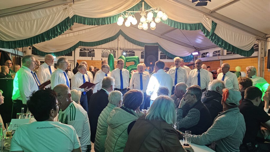 Am Donnerstag dem 2ten Oktober 2025 viel die Probe aus und wurde durch den Auftritt beim SV-Leuscheid im Festzelt getoppt. Der SV-Leuscheid feierte sein 105-jähriges Bestehen, dass der MGV-Eintracht-Leuscheid, sowie der MGV-Irsen und die Blaskapelle Leuscheid musikalisch begleiteten, bzw. zu einem ganz besonderen Ereignis werden ließen. In den darauf folgenden Tagen unterstützte der MGV-Eintracht-Leuscheid wie immer in alter Tradition beim Vorbereiten, Aufräumen, Verkauf der Biermarken und allem anderen was es so zu tun gibt.