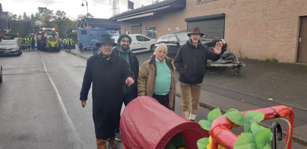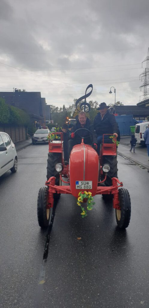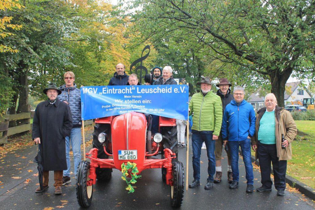 Im Anschluss an den Auftritt beteiligten sich die Sänger des MGV-Eintracht-Leuscheid e.V. nach vielen Jahren erstmalig wieder am Erntezug mit eigenem historischem Traktor und einem Wagen voller Äpfel 😉😉😉,die schnell an die am Wegesrand stehenden Gäste und Zuschauer verteilt waren. Trotz Regen, Wind und ungemütlichen Temperaturen hatten alle Beteiligten viel Freude.